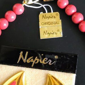 Matching earrings are the clip back style with screws on the clips to adjust the tension. Earrings measure 1 1/2 inches by 1 1/4 inches. Signed Napier on the back of each clip.