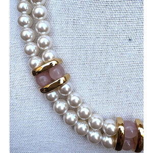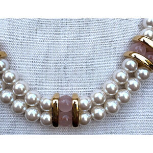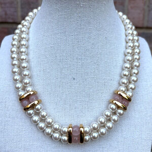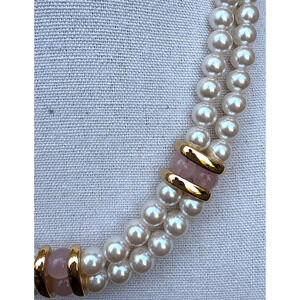 Vintage Napier Double Strand Faux Pearl Rose Quartz Choker Necklace Gold Tone 16"