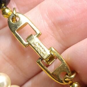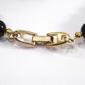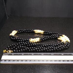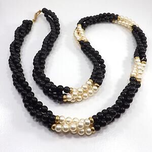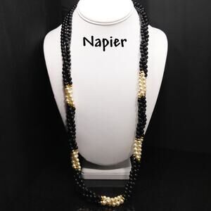 *Description: This is a great vintage long beaded Napier necklace, with Lucite black beads and faux pearls, from the 1980s. It is stamped NAPIER and Pat. Pend. #4.774.743 on the gold tone alligator clasp. The beads are 6mm black Lucite beads then a gold tone spacer bead; the next section beginning with creamy white faux pearls. The pattern continues on all three strands that are twisted together to form a great, lightweight necklace that would be a statement necklace and go with many outfits. It could also be a great vintage gift.