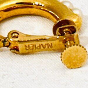Classic Napier vintage gold-tone screw back earrings with faux pearls. The pearls are all uniform in size and have a great lustre. The half round arc with the pearls meaures approx. 1.5 inches. The screw back is lever style, which makes for easy on/off. Signed Napier inside the earrings as well as on the screw back lever. Overall very good condition. The gold tone finish is great with minimal to no signs of wear.