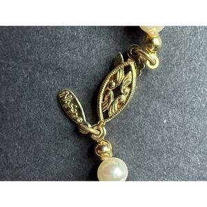 The Vintage Napier Gold Tone Graduated Twisted Three Strand Faux Pearl Necklace is a stunning accessory that exudes elegance and sophistication. Signed by the renowned brand Napier, this necklace features three strands of golden cream faux pearls, intricately twisted together for a unique and stylish look. The gold tone metal adds a touch of luxury, while the lobster closure ensures a secure fit. With a vintage flair and a necklace length of 17.5 inches, this original piece is perfect for adding a classic and timeless touch to any outfit.