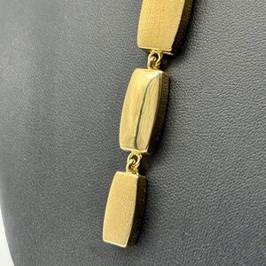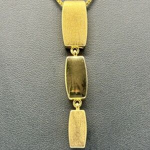 Vintage Napier gold-tone necklace features a textured, elongated elemental pendant that hangs from a lovely, slim, braided gold-tone chain. The pendant measures 3-1/2 inches long and the chain is 36 inches long. A metal tag marked Napier hangs from the end of the chain, and the Napier mark also appears on the middle section of the pendant. This necklace is stunning worn full length, but can also be wrapped around the neck twice before securing the Lobster clasp for a shorter style. This sleek, modern, and timeless piece is in excellent condition.