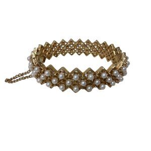 Vintage Napier Gold-Tone Pearl Bracelet With Safety Chain & Lattice Design