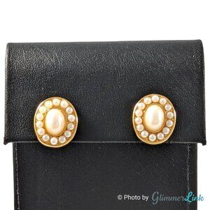 Vintage Napier Oval Faux Pearl Cabochon Gold Tone Pierced Earrings