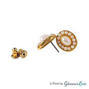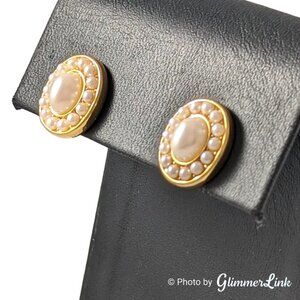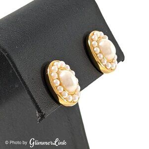 Vintage Napier gold tone earrings featuring a faux pearl cabochon surrounded by smaller faux pearls.