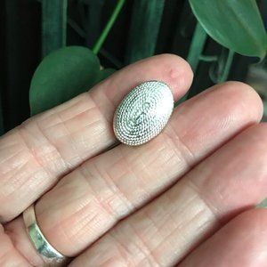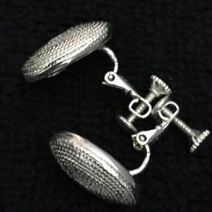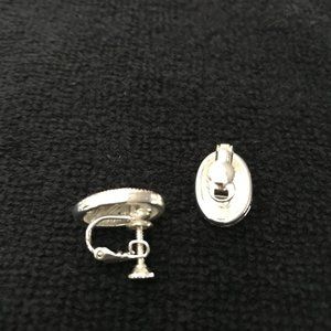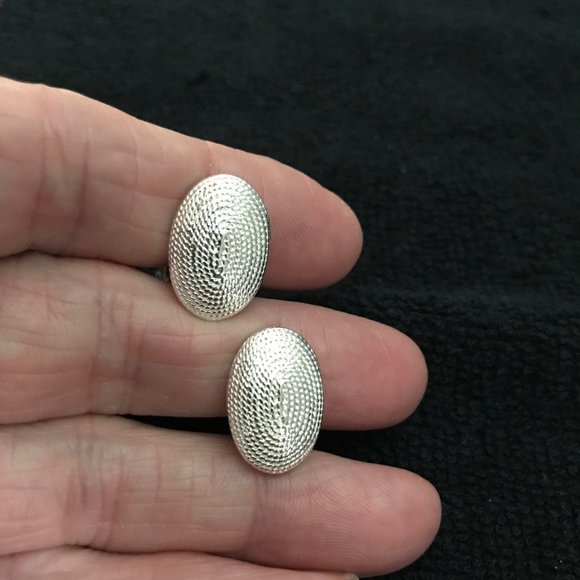 Hard to catch the lovely pattern on these earrings due to the shine, as they are brand new, never used, and in pristine condition. Small ovals have a circular, beaded line pattern on them, with secure clip & screw backs. Very lightweight. Hallmarked Napier on the clip. Dainty and very stylish for those of you still wearing clips. D0957