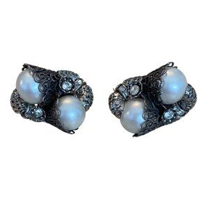 These vintage Napier clip-on earrings exude elegance with their intricate silver tone detailing, featuring faux pearls and sparkling rhinestones. Ideal for those seeking a timeless, sophisticated accessory for formal events or everyday wear, adding a touch of vintage glamour to any ensemble.