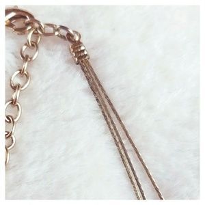 Gold tone Napier crystal necklace with 3 wire strands with various shades of red/pink crystals and a lobster claw clasp closure.