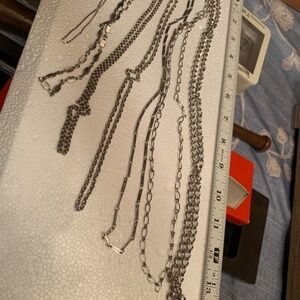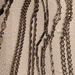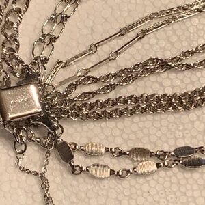 Napier Six Strand Chain Necklace. Six unique chains of varying lengths connected by a single Napier clasp. This was very hard to unravel but looks great when properly presented. Close up pictures detail the different chain styles. And that is all I know about it.