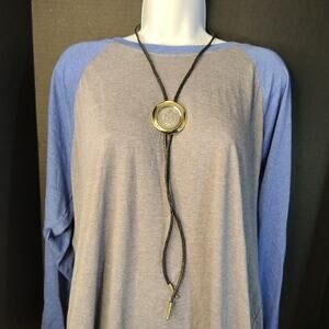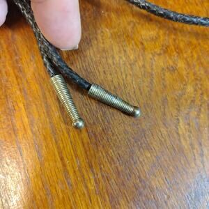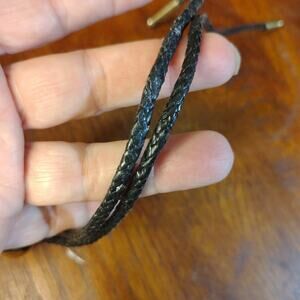 Vintage Napoleon Coin Bolo Tie Bola Tie Shoestring Necklace. Gold Tone and Dark Silver on black braided cord. Antique silver colored coin is mounted in a gold-colored circular setting. Preowned excellent condition with a few scratches on the gold mount.