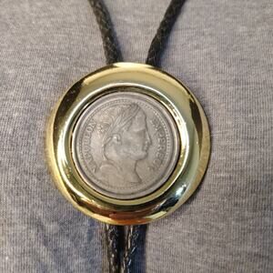 Vintage Napoleon Coin Bolo Tie Bola Tie Shoestring Necklace Gold Tone & Silver