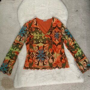 Vintage Naro Za Orange Colourful Funky Patterned Mesh Long Sleeve