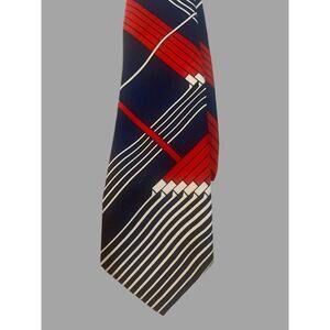 Unleash your power play with this bold silk tie, flaunting a striking geometric pattern in vivid red, navy, and white. Its sharp angles and lines demand attention, perfect for anyone ready to make a fearless statement in any boardroom or event.