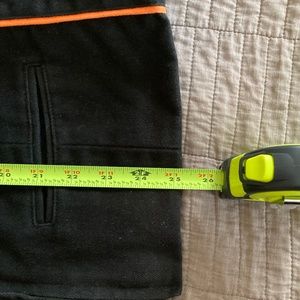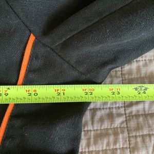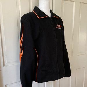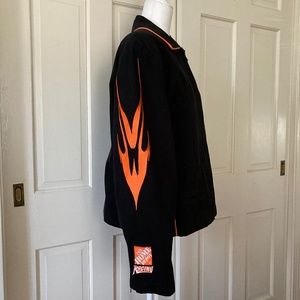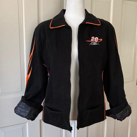 Chase Authentics Black and Orange Vintage 100% cotton zip- up jacket with one six inch zipper on each sleeve, for rolling cuffs up if desired.. The sleeves have embroidered Home Depot and Joe Gibbs Racing logos.The jacket has two front pockets.Shoulders are padded. The lining is 100% Nylon with Chase logo pattern. Orange Flames adorn each sleeve. Orange piping trim accents the collar and the front side/back side just under the sleeves to the hem.The back has a spectacular" number 20 Tony Stewart signature" emblem. Measurements are: Pit to pit = 22 1/2 inches, Sleeve length from shoulder top to sleeve hem = 24 inches, Length from Shoulder top to hem = 25 inches. Purchased in the mid 80's at the Daytona Race Track Store, worn only twice.