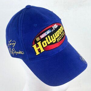 Vintage NASCAR on FOX Hollywood Hotel hat by Chase Authentics in bold royal blue with vibrant yellow embroidery featuring the names Darrell Waltrip, Larry McReynolds, and Jeff Hammond. This adjustable one-size cap is made of 100% cotton and includes detailed NASCAR and JC logos, as well as its original tags. A true throwback to early 2000s racing broadcasts, this cap is perfect for collectors or fans of NASCAR history.