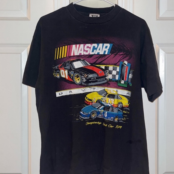 Vintage Nascar Tee size large. The t-shirt is soft cotton. It is great to pair with leggings or a pair of vintage jeans. The shirt is a size large and can be worn on a size small or medium individual for a baggier fit. This piece is vintage so the material is a tad bit worn but there are no holes, tears, rips, etc. The graphic is vibrant and colorful.