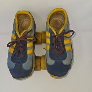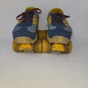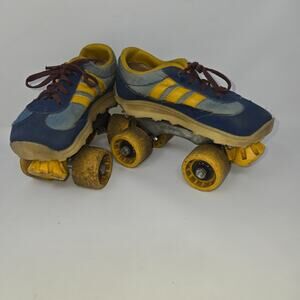 This is a pair of Adidas Nash Cruisers in Blue with Yellow Stripes in approximately a Size 13. They are 7.25 inches long. They have all original parts. These skates have significant use and signs of wear but they are complete and wheels move as intended. They do not have any rips or tears, merely expected cosmetic wear from use and age. The wheels are well-used but perfectly usable for outdoor use. The can be changed to new wheels safe for an indoor surface. They are perfectly usable as-is but could probably be cleaned and look closer to new.