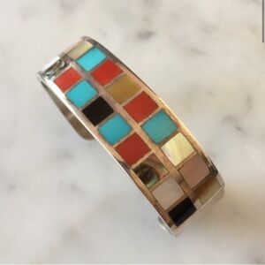 Gorgeous eye catching mosaic Navajo bracelet. Handcrafted and signed by the artist Alex Becenti, AB. A colorful array of stones turquoise, red coral, abalone, mother of pearl and jet, in a geometric mosaic design.