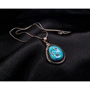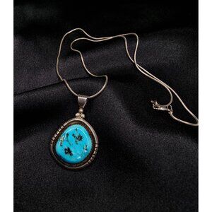 Vintage Native American Blue Turquoise Pendant On Sterling Silver Chain Necklace