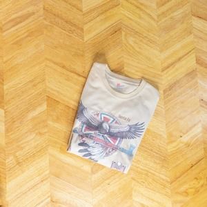 This vintage graphic t-shirt features an eye-catching design with American eagles and Native American motifs, perfect for adding some bold style to your wardrobe. Made from a comfortable and breathable cotton blend jersey fabric, this shirt is easy to care for and has been preshrunk for a consistent fit. The crew neck and short sleeves make it ideal for wearing in all seasons, whether you're hitting the beach in summer or layering up for fall.