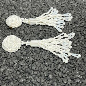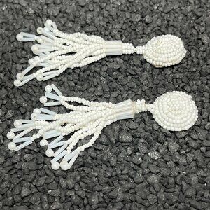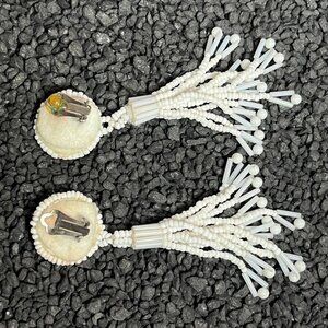 Vintage Native American white beaded clip-on tassel earrings. The intricate beadwork and playful tassels add a touch of charm to any ensemble.