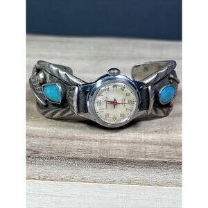 Vintage Native American Navajo Sterling Cuff Bracelet Oval Blue Turquoise Caravelle Watch.