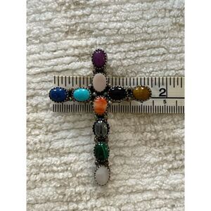 Well crafted vintage Native American sterling silver and multi stone cross pendant made by Navajo silversmith, Lenora Begay. I just love the soft palette of turquoise, black onyx, tiger's eye, lapis, moonstone, mother of pearl, spiny oyster and malachite gemstones.
