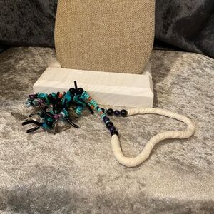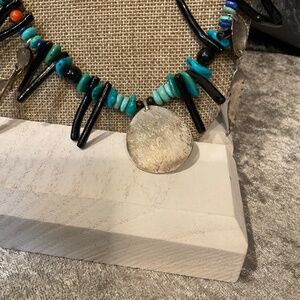 Vintage Native American Richard Begay Sterling Silver, Onyx, Coral, Lapis, and Turquoise Bear Paw Necklace. Necklace is 30" long. Every silver pierce is stamped and carved as Sterling RB. 5 sets of sterling charms, 4 are feathers and gemstones and the center one is a bear claw. 10-1/4" twisted linen at the neckline. Excellent Condition.