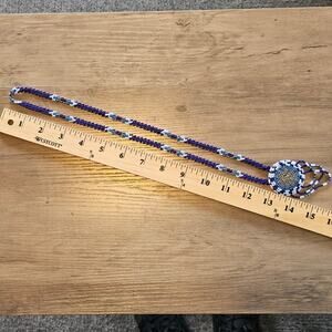 Vintage seed bead necklace. Shades of blue with white and a gold sun / star like pattern in the center. Handcrafted artisan piece.