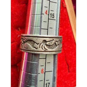 This vintage Native American ring features intricate Kokopelli designs, symbolizing fertility and joy. Crafted from sterling silver, it embodies cultural artistry and heritage.