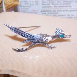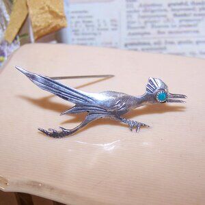 Vintage Native American Sterling Silver Roadrunner Pin Brooch - Turquoise Eye