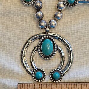 This Vintage Native American Sterling Silver Squash Blossom Necklace features a horseshoe shaped pendant adorned with natural blue turquoise stones set in bezel settings. Made of Sterling silver and weighing approximately156 grams (5.5 oz.), the necklace is adjustable from 24-27 inches long.
