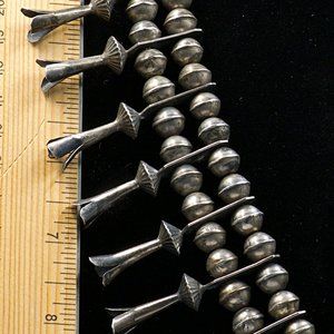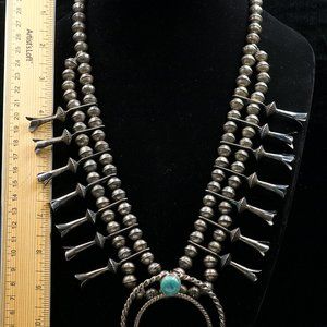 Very nice vintage Native American Sterling Silver, Turquoise Squash Blossom. Unsigned. Squash is approximately 25-1/2" in length, Fourteen blossoms total. Three stones on Naja. Beads are handmade. Naja measures approximately 2-3/4" x 2-3/4". Total weight 176 grams.