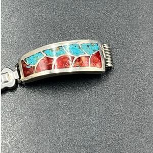 This exquisite vintage watch band bracelet showcases the finest traditions of Native American craftsmanship with stunning turquoise and coral inlay work set in genuine sterling silver. The piece features a sophisticated geometric pattern with vibrant turquoise stones alternating with rich coral segments, all meticulously inlaid and separated by elegant silver channels that create a striking visual contrast.