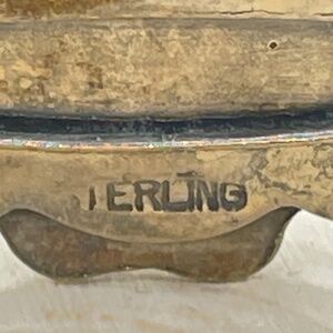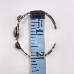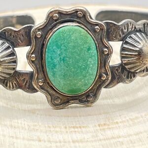 Vintage Native American sterling and turquoise cuff bracelet -- CHILD'S size or for very small wrist. It measures only about 1 7/8"" across the opening with very minimal adjustment. Green turquoise center oval stone is bezel set and enhanced with stamped Southwestern Native American design. The center design is about 3/4". It is stamped sterling inside the band. No other marks. Pre-owned. Please ask if you have questions.