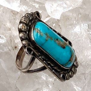 This fabulous vintage Native American sterling ring features a rich blue turquoise with matrix in an ornate setting. The large oval stone, measuring 1" by 1/2", is surrounded by a detailed design of curling silver wire and stamped raindrops. The ring is a size 5, but can be sized by a competent silver smith. Guaranteed sterling, but not marked like so many old Native American pieces. This ring is perfect for those with a smaller finger size who still like to sport impressive pieces!