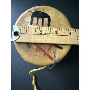 The product is a vintage Native American stretched rawhide leather drum that has been hand-painted. It is a unique and traditional musical instrument that reflects the cultural heritage of Native American tribes in the United States. Handmade with care and attention to detail, this drum is not only a functional instrument but also a beautiful piece of art that would make a valuable addition to any collection of cultural artifacts.