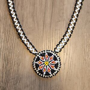 Vintage Native American Tribal Black & White Seed Bead Flower Pendant Necklace