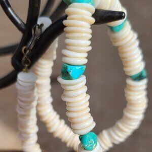 This Native American turquoise and white puka/heishi shell necklace features a traditional beaded style with a hook closure. The necklace is 17 inches long and includes 5 stunning natural turquoise stones, perfect for those who appreciate nature, Western, beach, and bohemian themes. Handmade in the United States, this piece showcases Native American tribal affiliation and craftsmanship, making it a unique and culturally significant accessory for both men and women. Strung on metal threading so it can take every day wear and tear.