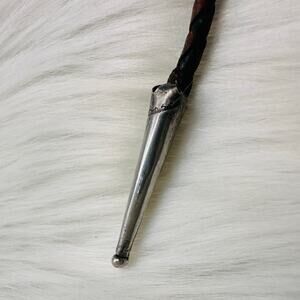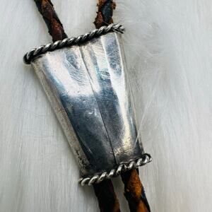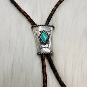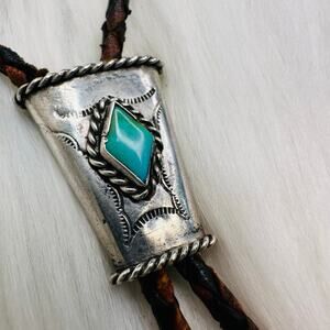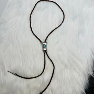 Vintage Native American Western Bolo Tie Sterling Silver and Turquoise. Braided brown leather cord. Slide moves up and down. Unmarked but tests as 925 Sterling Silver. Slide measures approx 1”x 1.5”. Cord is 36” long. Good used condition.