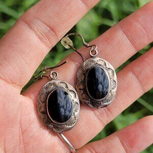 Gorgeous high-quality stones and silver. Native American handmade with oval onyx cabachon bezel set in 925 sterling silver. Wrapped in a fantastic border with hand stamp work. French wire hooks. Perfect amount of natural oxidization!!! No stamps as typical of older Native American pieces. True vintage. Natural, beautiful patina included. May need a cleaning depending on your preferences. Tested with a neodymium magnet and JSP acid, guaranteed sterling.