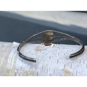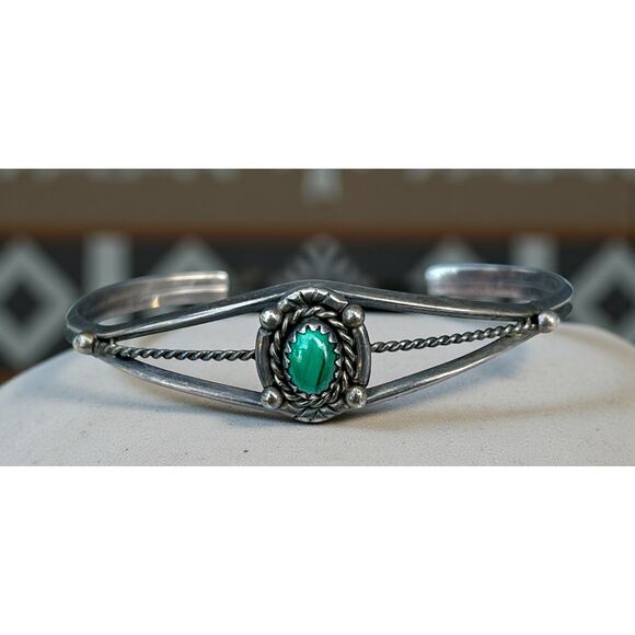 This classic Southwestern cuff features a genuine malachite cabochon framed by twisted rope and bead details in solid sterling silver. The open split-shank design makes it comfortable for daily wear while showcasing timeless Native American craftsmanship. A perfect addition to any vintage jewelry or turquoise & malachite collection.
