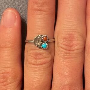 Dainty vintage native ring. So sweet! Sterling silver (not stamped), two small coral and turquoise circular stones with triangular edging next to a cute flower. Approximately a size 6. No major wear!
