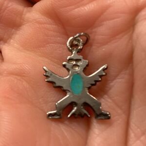 Channel the spirit of this sky deity, hero of Zuni folklore, with this small silver and turquoise pendant/charm.