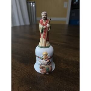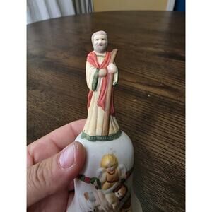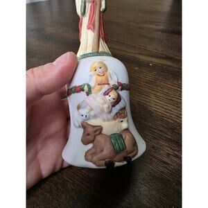 Charming vintage ceramic bell featuring a shepherd holding a staff on top, with an angel, lamb, and donkey nativity scene wrapped around the base. Hand-painted details with soft pastel colors.