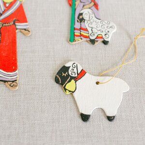 Includes Mary with Jesus, Joseph, an angel, sheep, two kings and a Shepard. Colors include red, green, yellow, white, light purple, black and wood tone background. All ornaments have a silky golden tone string - ready to hang on your tree or anywhere!