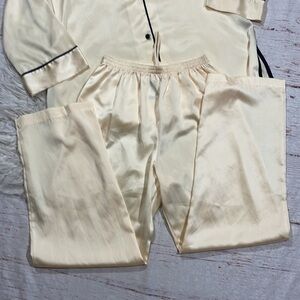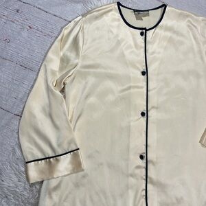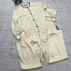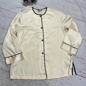 Vintage Natori Nieman Marcus cream and navy colored tunic button front pant pajama set. This set is in great used condition