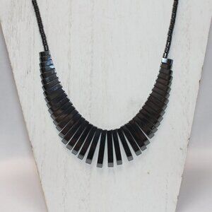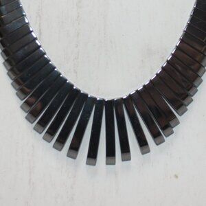 Statement necklace with this sleek graduated fringe hematite necklace. The necklace is 24” in length made up with 5mm cylinder beads and a 6 3/8” length of graduated bars measuring from 10mm to 40mm long. Fishhood filegree clasp closure. Very nice vintage condition.