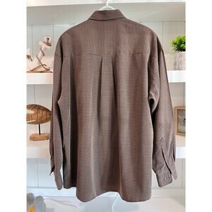 Add timeless retro flair to your wardrobe with this vintage Natural Issue long sleeve button-up shirt. Features a brown micro-check pattern, classic collar, and button cuffs. Made in Korea with a soft rayon/polyester blend for a lightweight, comfortable feel. Tagged size Large—please see measurements for best fit.