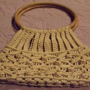 Vintage Natural Macrame Wood Round Handle Purse that is 10 inches wide by 8 1/2 inches from top of macrame to bottom.